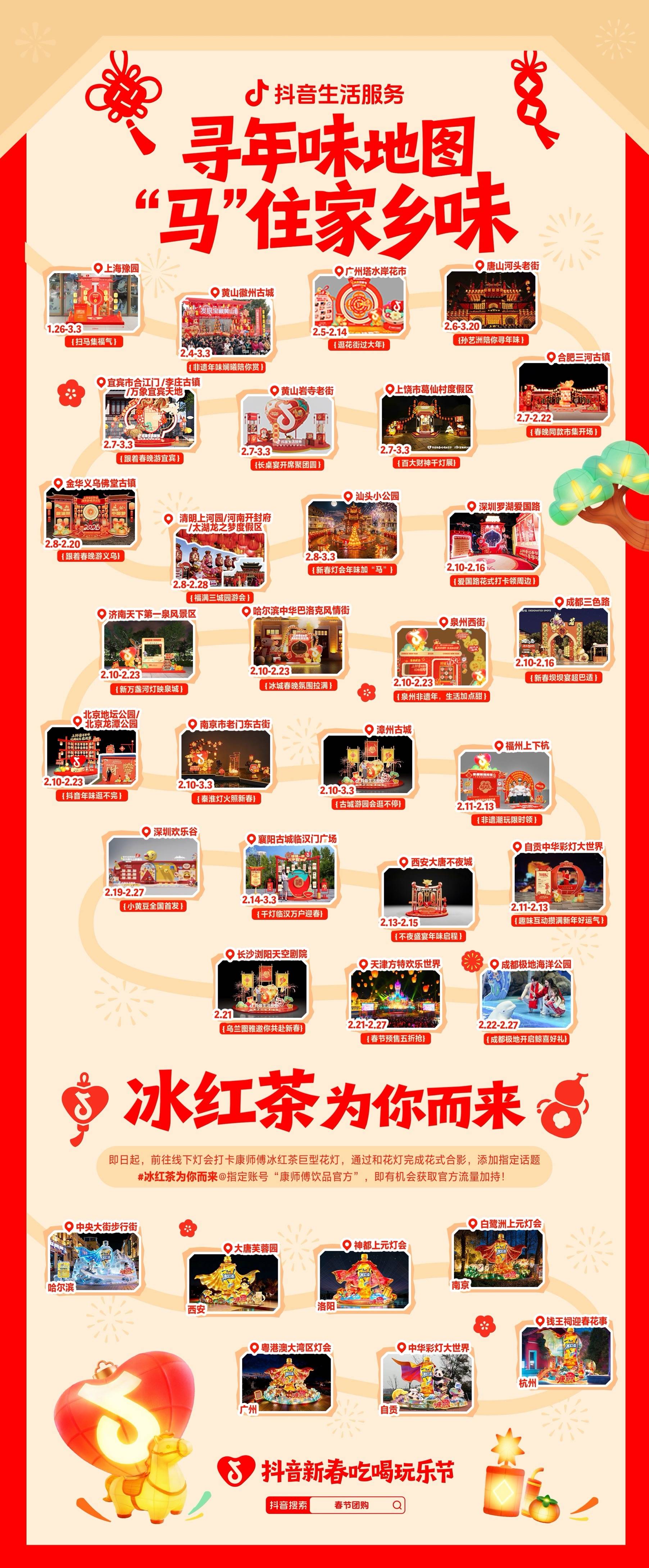 年味,不止在屏幕云端,还藏在你身边的街头巷尾。今年,「抖音新春吃喝玩乐节」特别打造了一场跨越南北的城市嘉年华,汇聚二十余座城市的独特年味,打造了各式灯会、庙会和市集,邀你感受最炽热的人间烟火气。